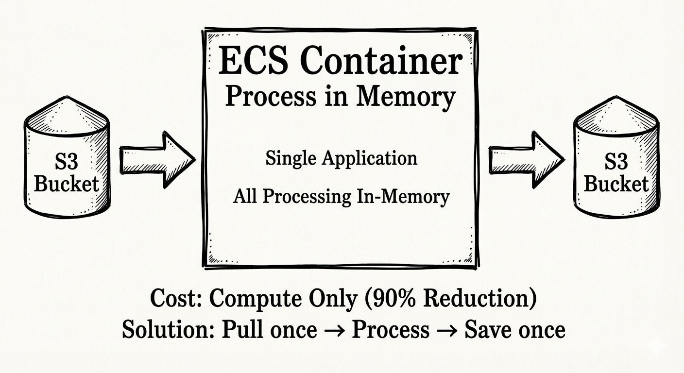 By moving everything into a single process, they eliminated the “S3 Ping-Pong,” the Step Functions orchestration fees, and the 15-minute Lambda wall.